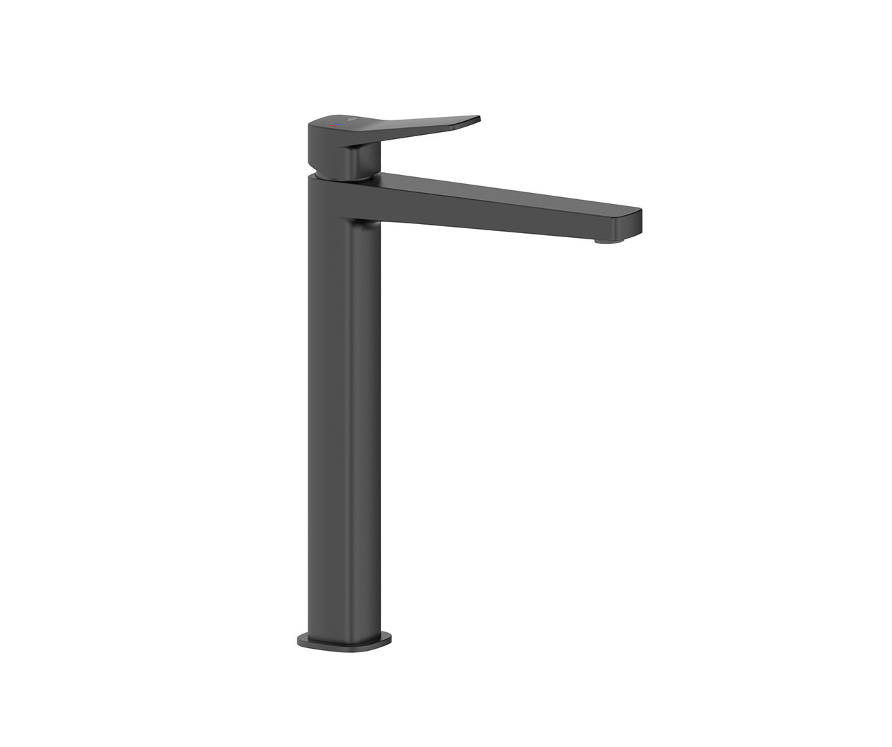 Hoge zwarte waskomkraan met click-clack afvoer. Ideaal voor opzetwastafels en designbadkamers.