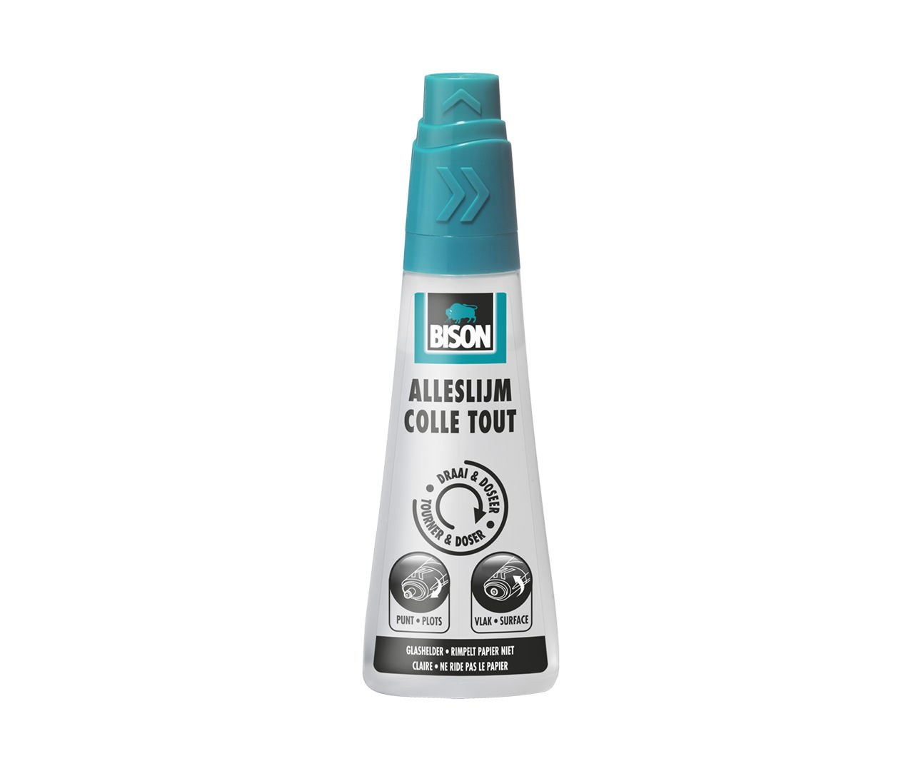 De Bison Alleslijm Draai & Doseer in een handige plastic fles met een unieke 3-positie twist-applicator is ideaal voor thuis, op school, op kantoor, knutselen en modelleren. Reinig de oppervlakken grondig voor het lijmen. Gebruik het zwarte precisie-mondstuk voor stippen of dunne lijnen, en draai het voor bredere toepassingen. Breng dun aan op één kant, druk samen en klaar! Wasbaar op 60°C met normaal wasmiddel. Let op: bevat brandbare oplosmiddelen, bewaar veilig. Oplosbaar in alkalische schoonmaakmiddelen voor vlekverwijdering op kleding. Bewaar op een koele, droge plaats.