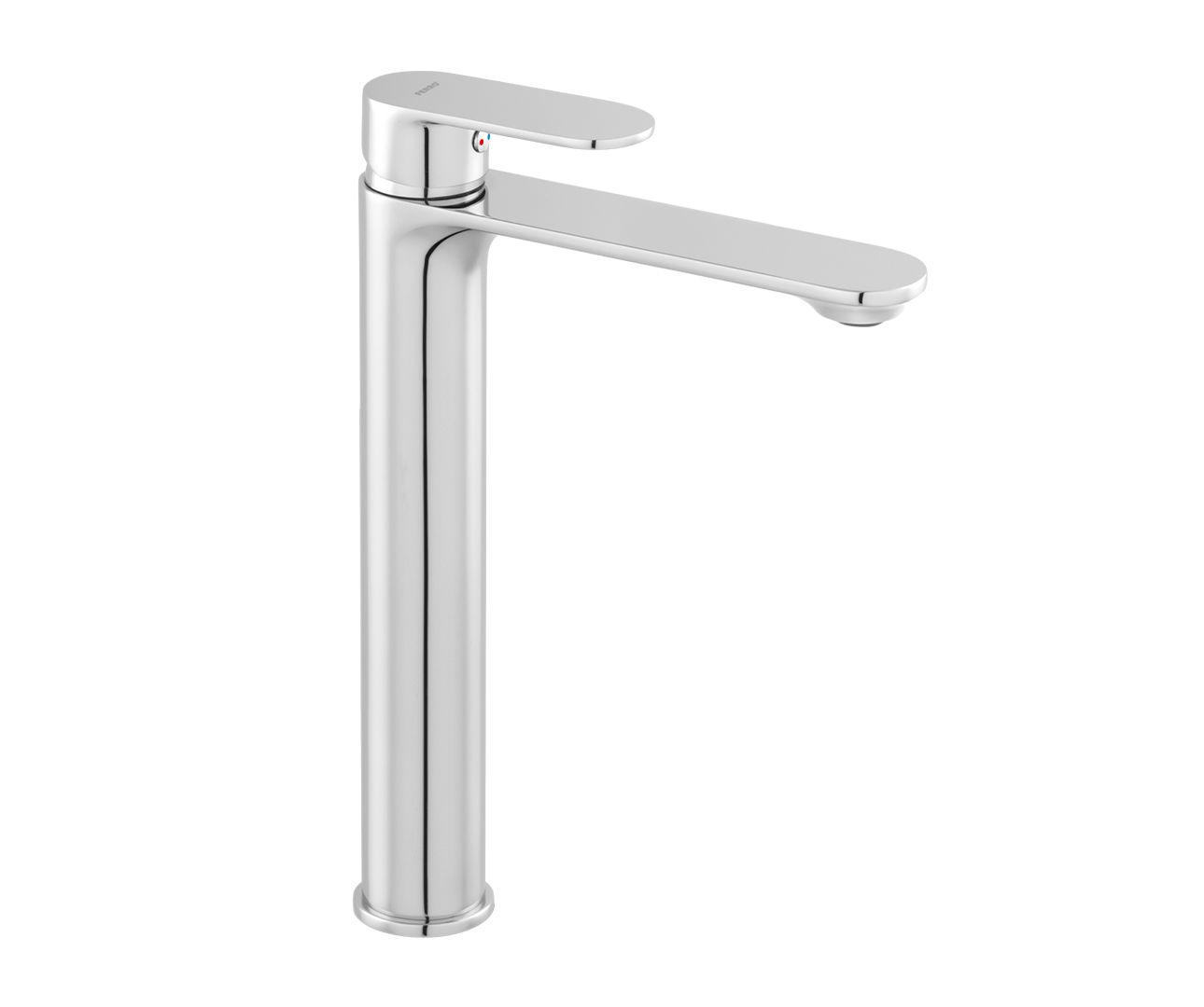 Hoge wastafelkraan in chroom, ideaal voor opzetwastafels.