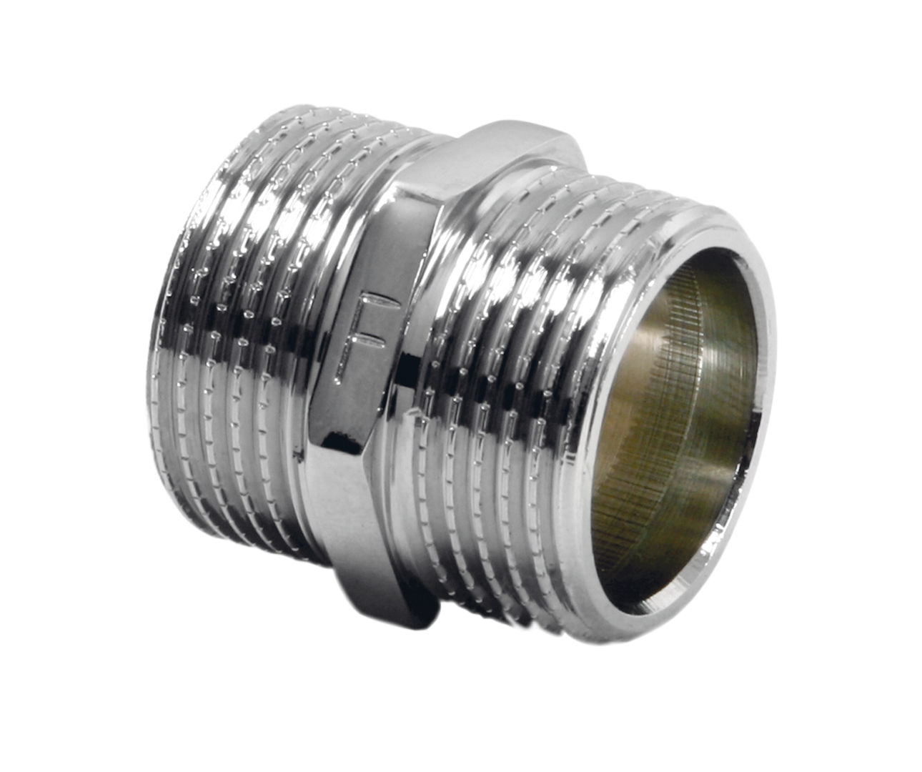 Messing nippel 1/2” M-M in chroom voor waterinstallaties.