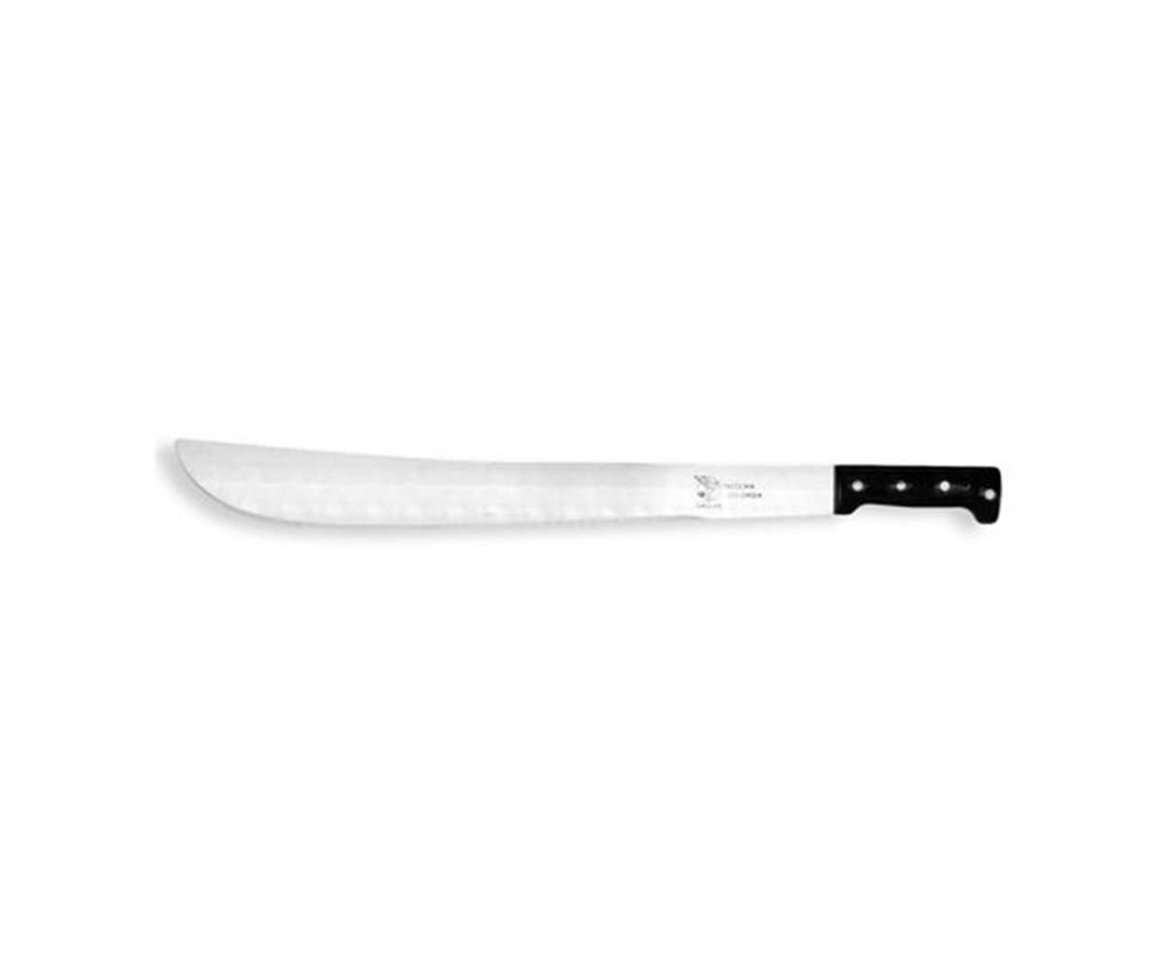 Deze houwer heeft een lemmet dat breed uitloopt en eindigt in een scherpe punt. De houwer heeft een recht zwart plastic handvat en is 330 mm lang.