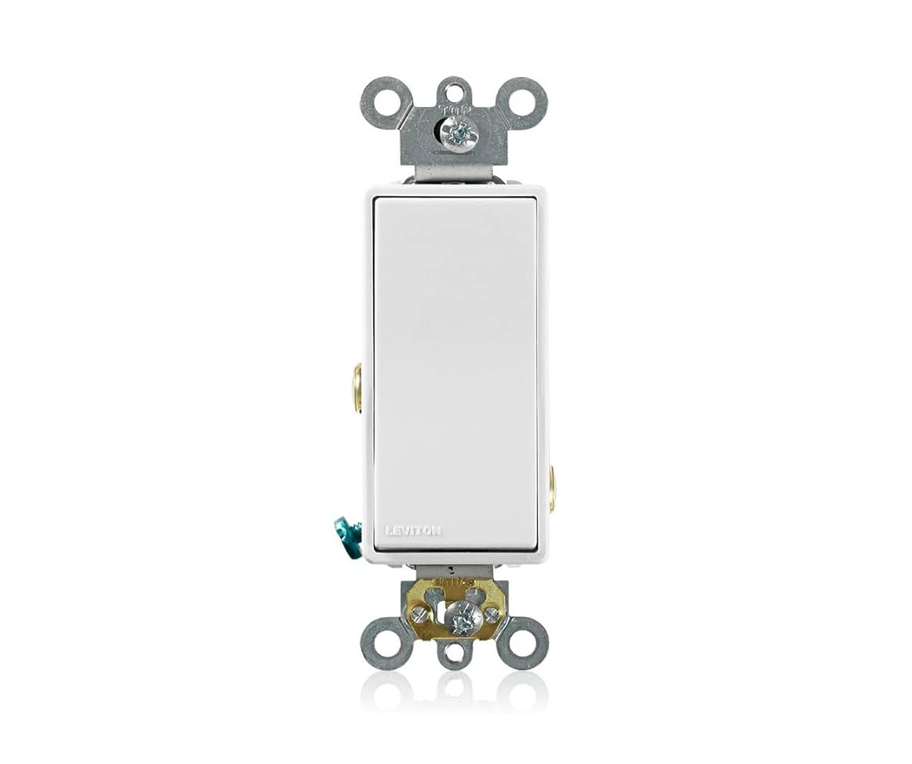 15 Amp, 120/277 Volt, Decora Rocker Enkelpolige AC Stille Schakelaar, Residentiële kwaliteit, Aarding - Grijs. Stille schakelaar regelt de belasting vanaf één locatie. Slagvaste constructie van thermoplastisch nylon. Quick wire push-in en zijbedrading voor eenvoudige installatie. Voor gebruik met Leviton Decora wandplaten.