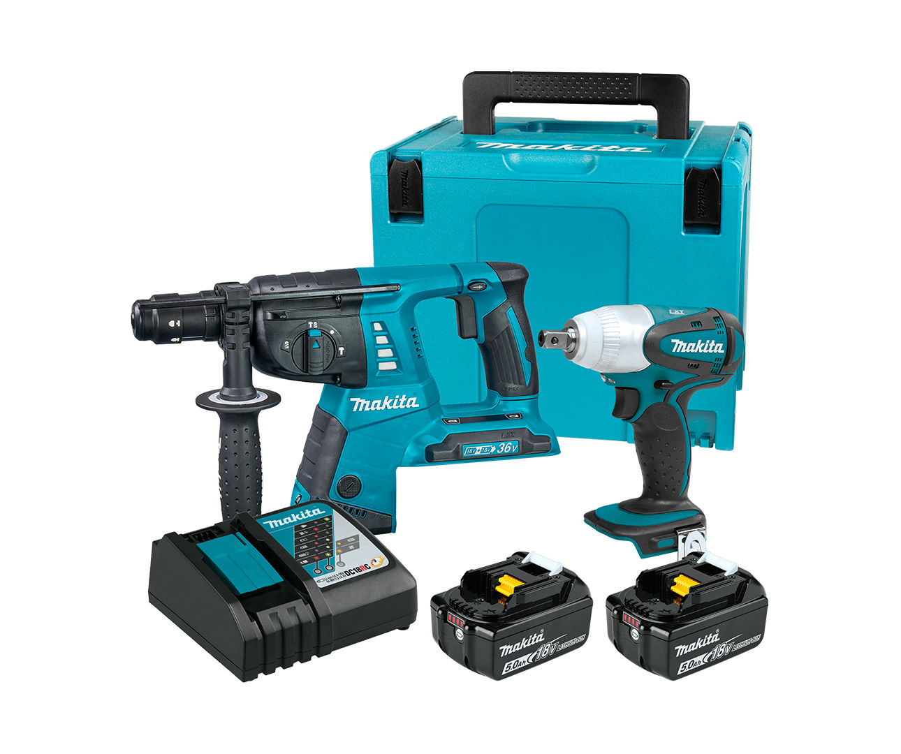 Deze Makita-combinatiesets bevatten draadloos gereedschap dat werkt op 18V-batterijen. 18V-batterijen en de gereedschappen die ze aandrijven zijn zwaarder maar leveren meer koppel dan gereedschappen die worden aangedreven door batterijen met een lagere spanning. Ze hebben voldoende vermogen voor een scala aan toepassingen, vooral bij constructie- en onderhoudswerkzaamheden. Gereedschappen die batterijen met een lagere capaciteit (Ah) gebruiken, zijn minder omvangrijk, maar slaan minder energie op dan gereedschappen die batterijen met een hogere capaciteit gebruiken.