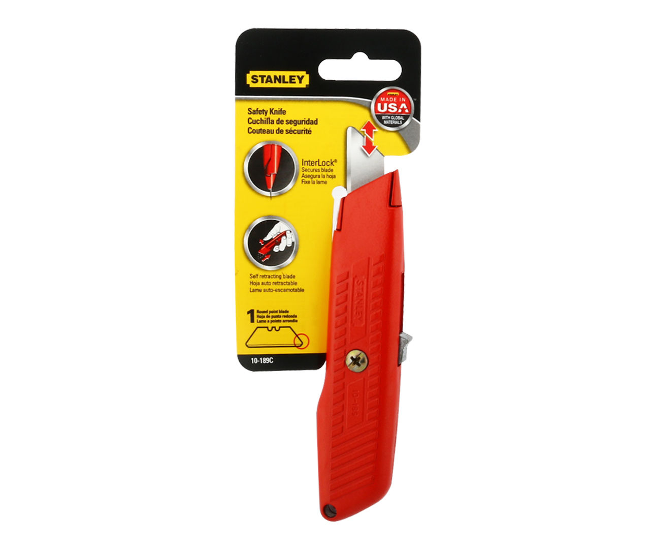 De uitschuifmessen van Stanley zijn veilig en oerdegelijk. Dit mes heeft een metalen handvat van 155 mm. Houdt de schuifknop naar voren tijdens het snijden, het schuift automatisch in.